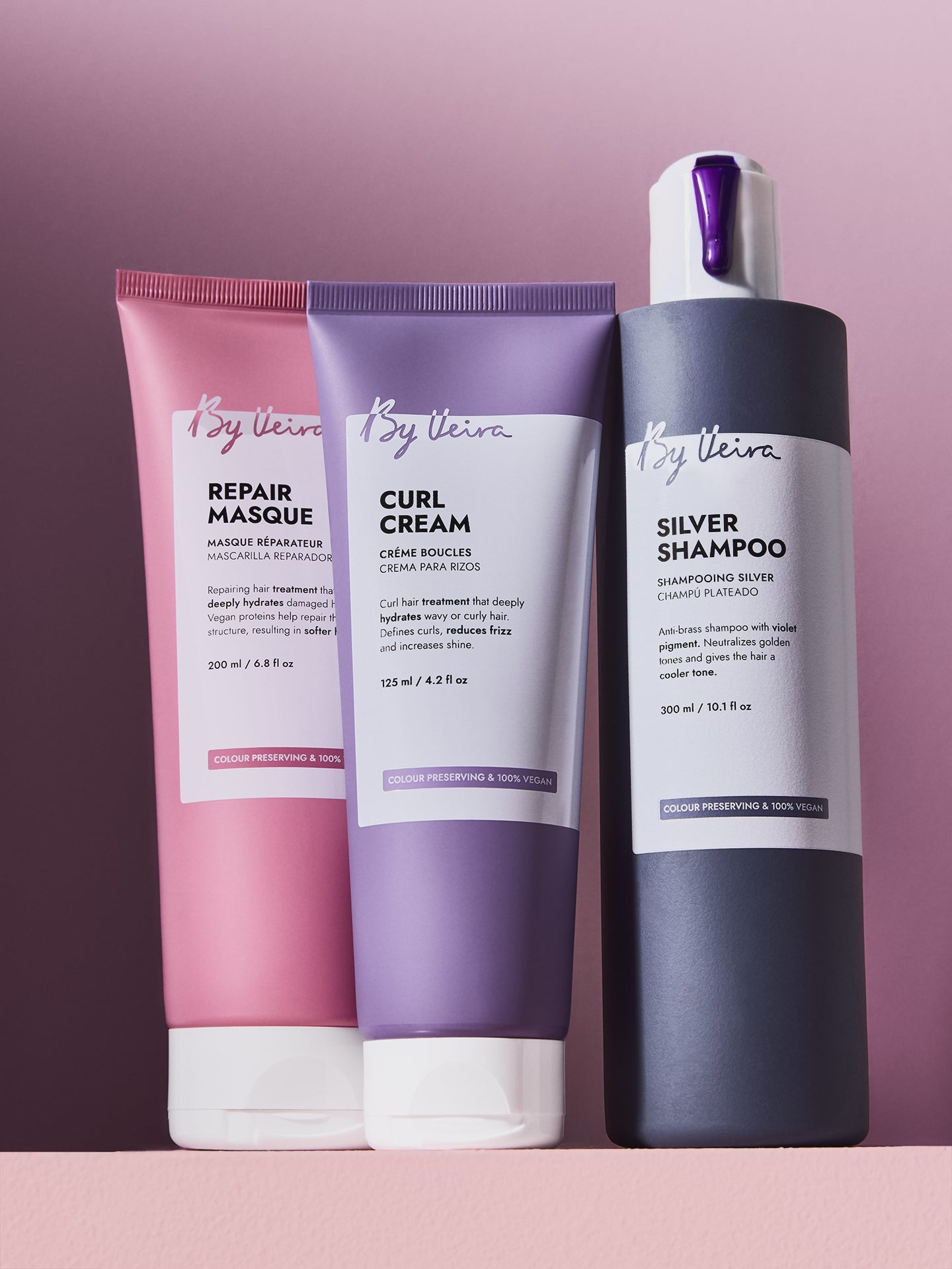 Keep your blonde, bleached, or grey hair bright and cool with By Veira’s Silver Collection. Infused with violet pigments, it neutralizes yellow and brassy tones while maintaining softness and shine. The gentle, color-preserving formulas leave hair luminous, smooth, and perfectly toned.